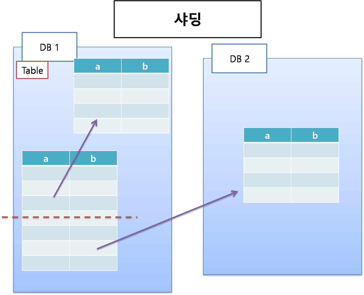 데이터베이스를 여러개로 나누어 분산시키는 기술용어로, 서비스 크기의 증가에 따라 DB의 크기가 증가하면서 성능을 향상시키기 위한 것이다. 자료가 매우 많아지면서 하나의 DBMS가 여러개의 테이블을 관리하기에는 성능적으로 문제가 생겼고 이에 따라 테이블을 나누어 관리하는 방법이 파티셔닝, 데이터베이스를 여러개 사용하는 방법이 샤딩이다.