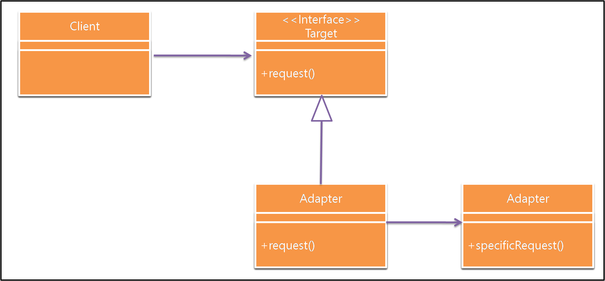 한 클래스의 인터페이스를 클라이언트에서 사용하고자 하는 다른 인터페이스로 변환한다. 어댑터를 이용하면 인터페이스 호환성 문제 때문에 같이 쓸 수 없는 클래스들을 연결해서 쓸 수 있다. 즉, 호환성 문제를 해결하기 인터페이스를 사용하여 같이 쓸 수 없는 클래스들을 연결해서 사용하는 것이다.