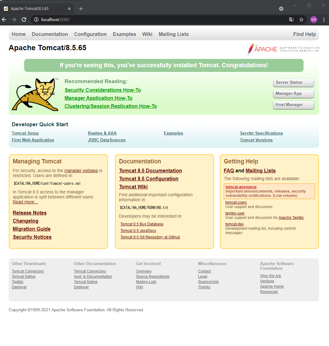 로컬 주소인 http://localhost:8080으로 확인 했을 때 위와 같은 페이지를 본다면 설치를 정상적으로 완료한 것입니다.