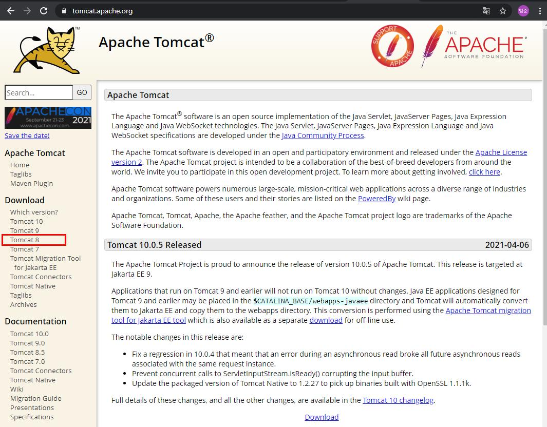 좌측에서 Download에 Tomcat8 버전을 설치해 줄 겁니다. 사실 무슨 버전을 써야할지 잘 몰라서 전에 사용해 봤던 8버전을 받을 거에요.