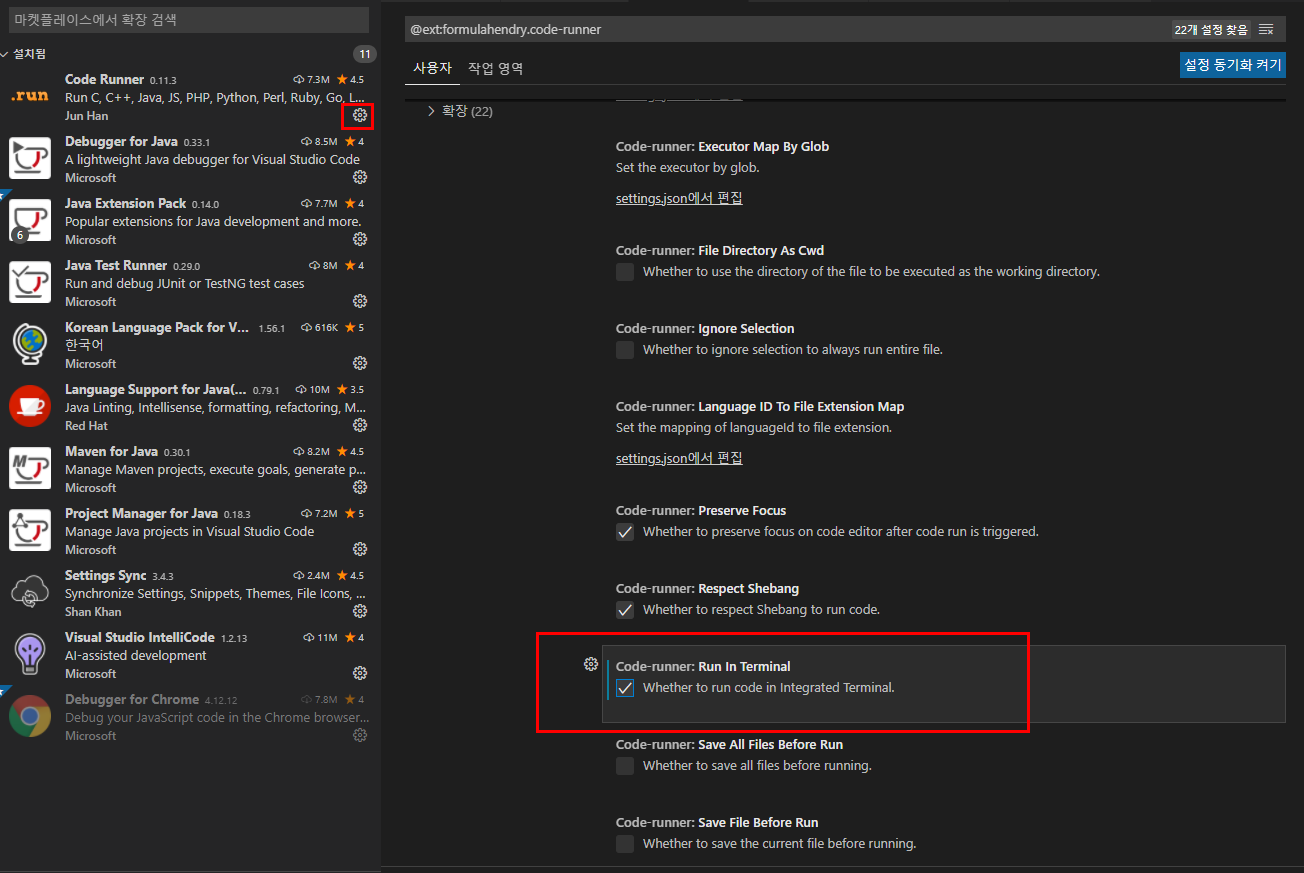 찾기 귀찮으시면 settings에서 "@ext:formulahendry.code-runner"를 검색하시거나