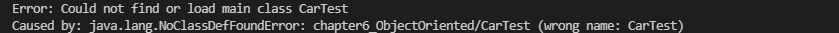 Caused by: java.lang.NoClassDefFoundError: chapter6_ObjectOriented/CarTest (wrong name: CarTest)