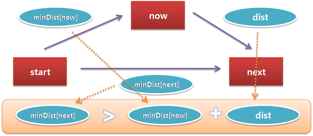 다음과 같이 start에서 next로 바로 가는 것 보다 start에서 now를 거쳐서 next로 가는 것이 더 쌀 경우 minDist[next]에 minDist[now]+dist를 넣어주는 겁니다. minDist[next]와 minDist[now]에는 각각 next와 now까지 가는 가장 싼 값이 들어 있는 상태에서 말이죠..