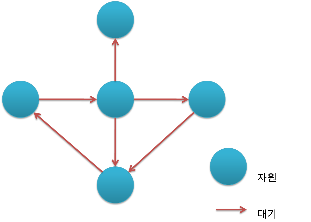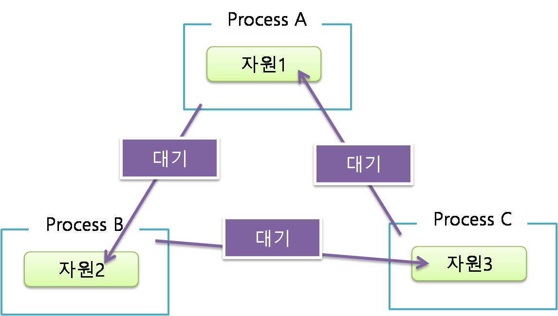 - 프로세스A는 자원1을, 프로세스B는 자원2를, 프로세스C는 자원 3을 각각 소유하고 있으면서 다른 자원을 사용하기 위해 대기하고 있습니다.