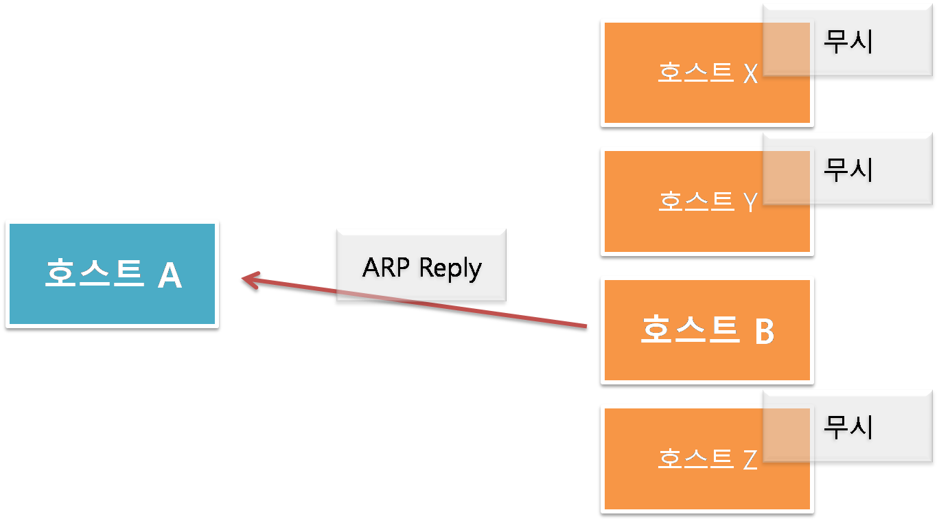 - 호스트B는 자신의 IP주소와 ARP request의 목적지 주소가 같기 때문에 ARP Reply에 자신의 MAC주소를 추가하여 전송한다.