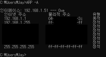 개인의 PC에서도(윈도우 기준) 위와같이 cmd창을 열어 arp -a 명령어를 입력하면 ARP캐시 테이블을 확인할 수 있다.