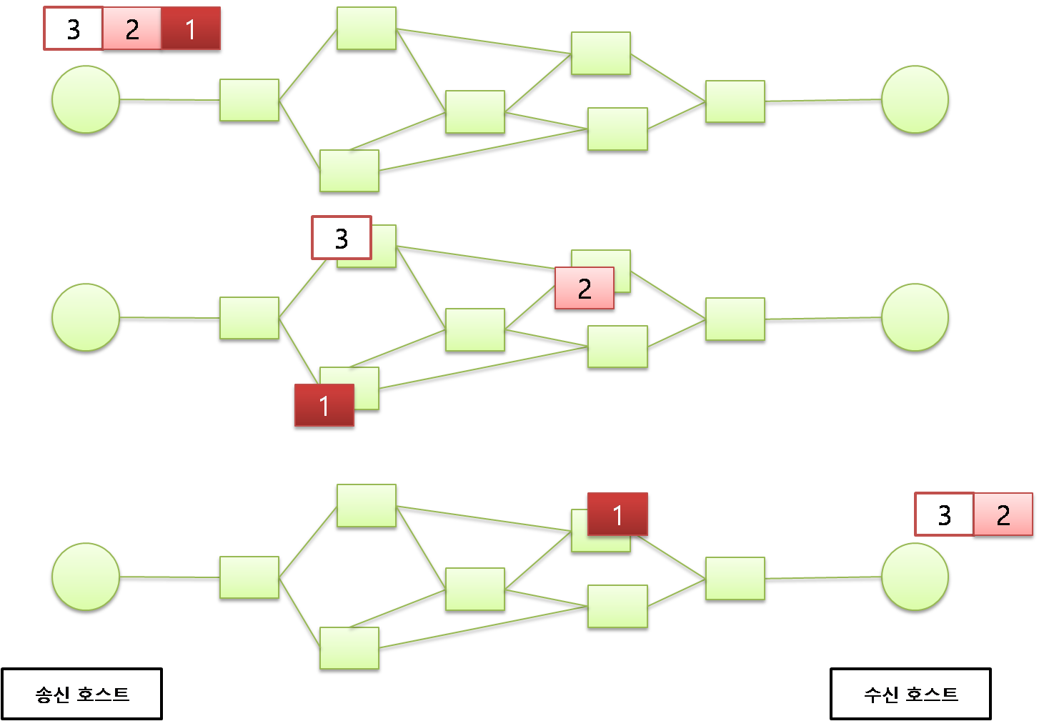 이와같이 송신 호스트가 1->2->3번 순서대로 패킷을 보냈어도각자 다른 경로로 전송되고 각 패킷마다 독립적으로 처리된다는 특징이 있습니다.