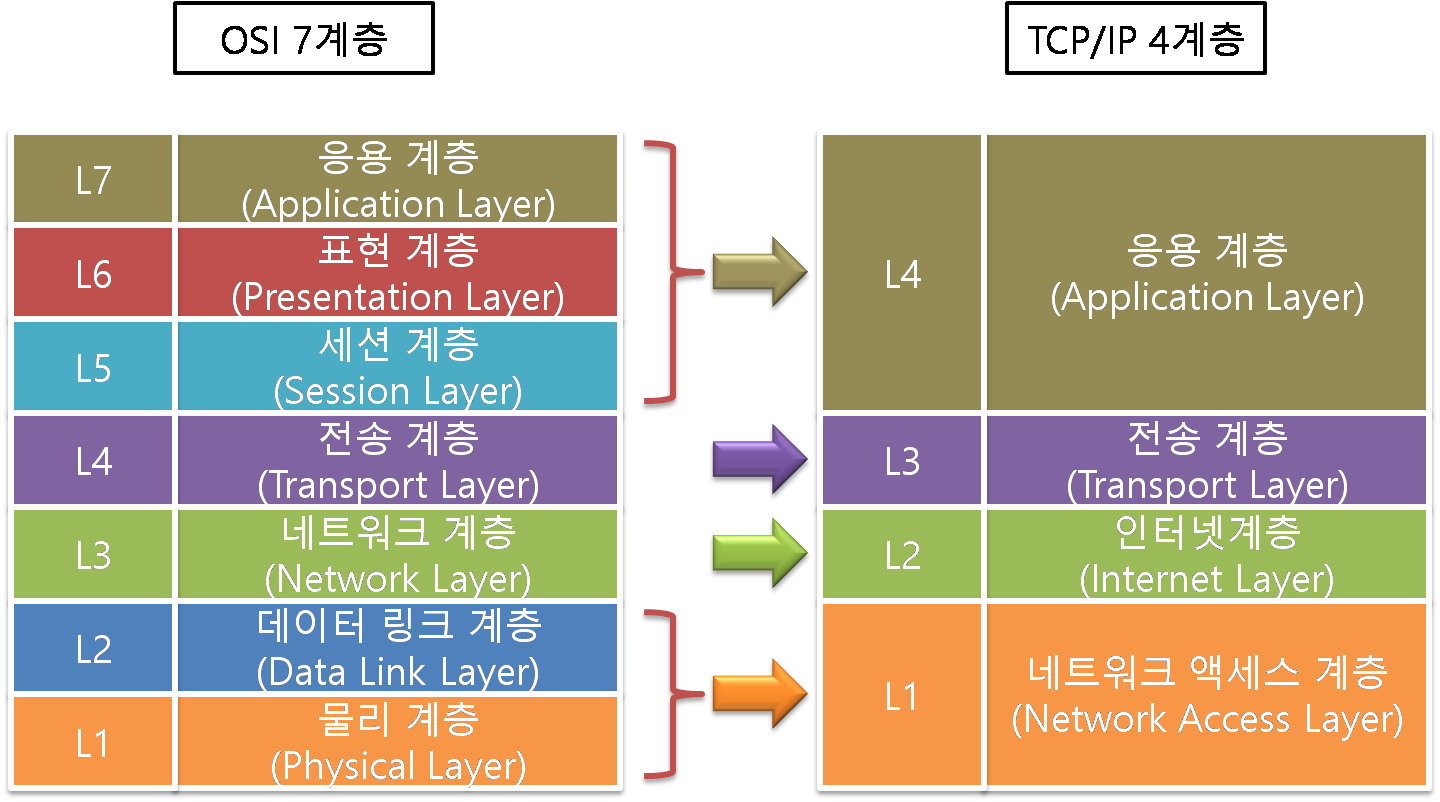 - 네트워크 액세스 계층( OSI 7-> 물리+데이터링크 )