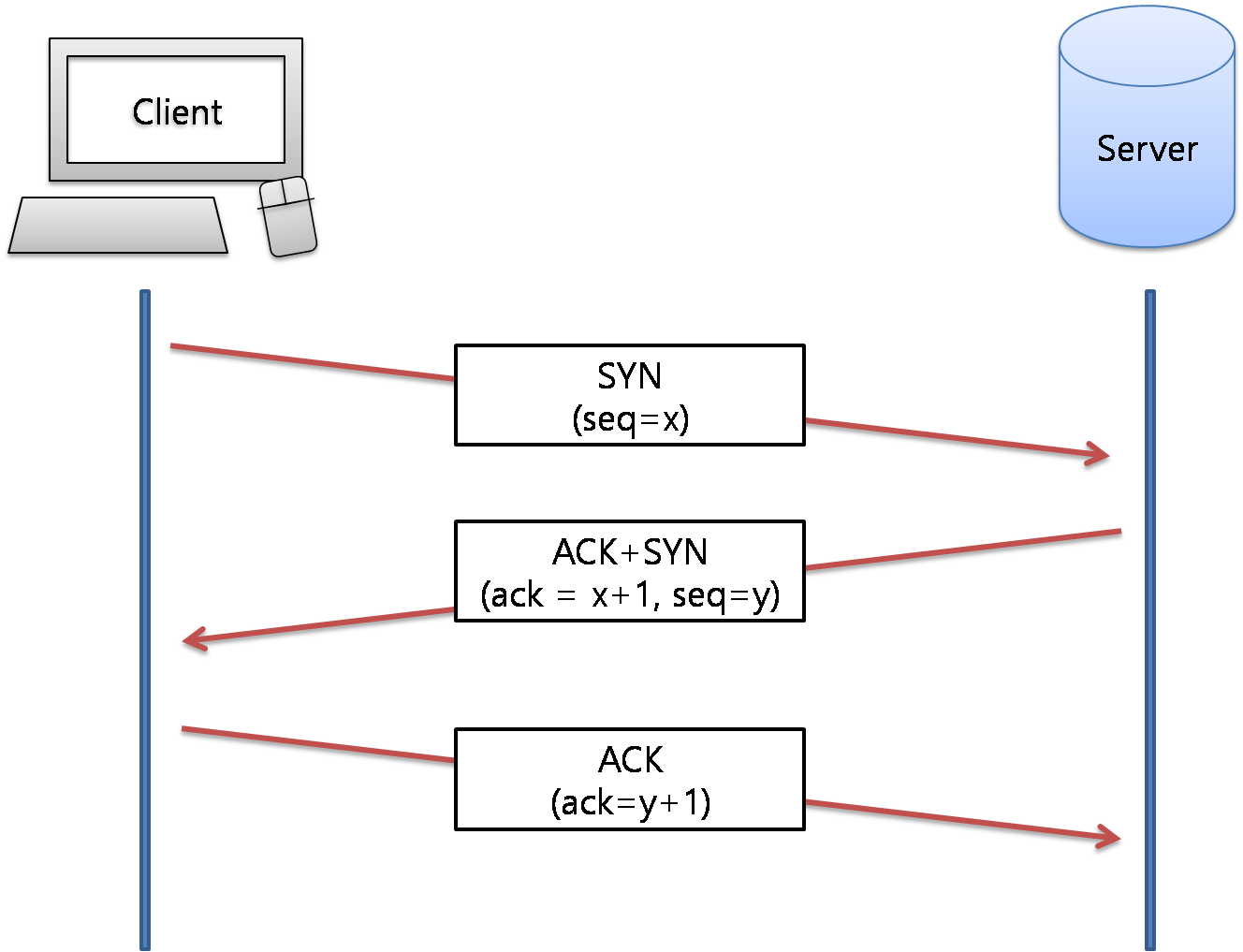 - 서버는 이에 대해 요청을 받았다는 것을 클라이언트에게 알리기 위해 SYN메세지에 대한 응답으로 순서번호에 1을 더한 x+1을 ACK메세지로 보내고 서버도 클라이언트와 연결을 하기 위해 랜덤으로 순서번호(y) SYN메세지를 함께 보낸다.