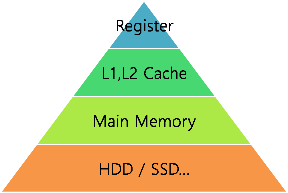 메모리 계층은 다음과 같다. 위 피라미드를 크게 3부분으로 구분할 수 있다. 상위계층일 수록 CPU의 접근시간이 빠르며 용량이 작은 반면 하위계층일 수록 용량은 크지만 CPU의접근시간이 길어진다.