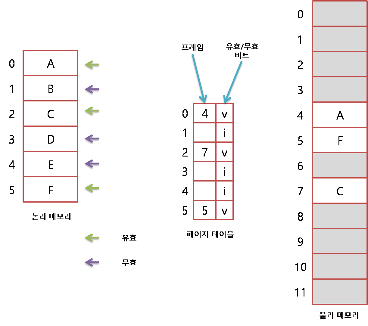 이런 절차를 위해서 해당 프로세스의 페이지가 메모리에 올라 왔는지를 관리해야 한다. 이는 페이지 테이블의 유효/무효비트를 통해 충족시킬 수 있다.