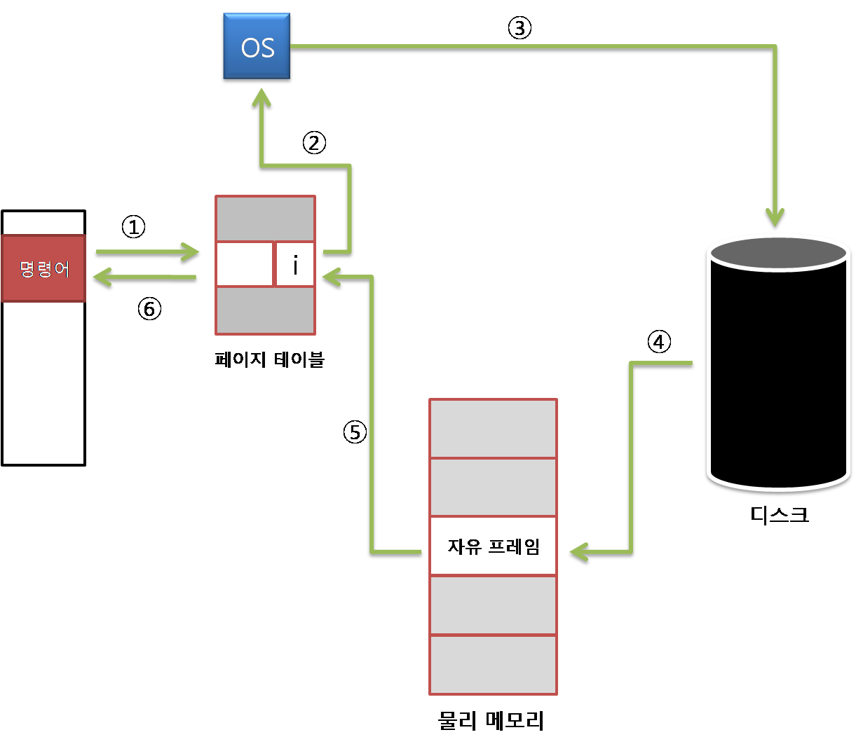 - 디스크에서 물리 메모리로 페이지 적재가 완료되면 페이지 테이블을 갱신한다.(i->v, 해당 자유 프레임 번호 등..)