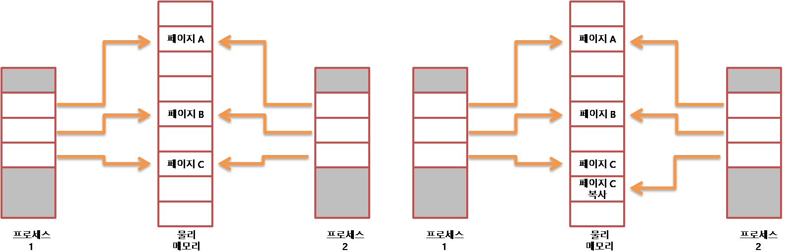 fork()를 실행한 후 자식 프로세스는 보통 exec() 시스템 호출을 하여 부모로 부터 복사한 페이지들은 다 쓸모가 없어지게 된다. 따라서 부모페이지들을 모두 복사하는 대신 쓰기 시 복사(copy- on write) 방식을 사용할 수 있다. 처음에는 자식 프로세스가 부모의 페이지를 같이 쓰다가 둘 중 공유 페이지에 쓰기를 할 때 복사하겠다는 것이다.