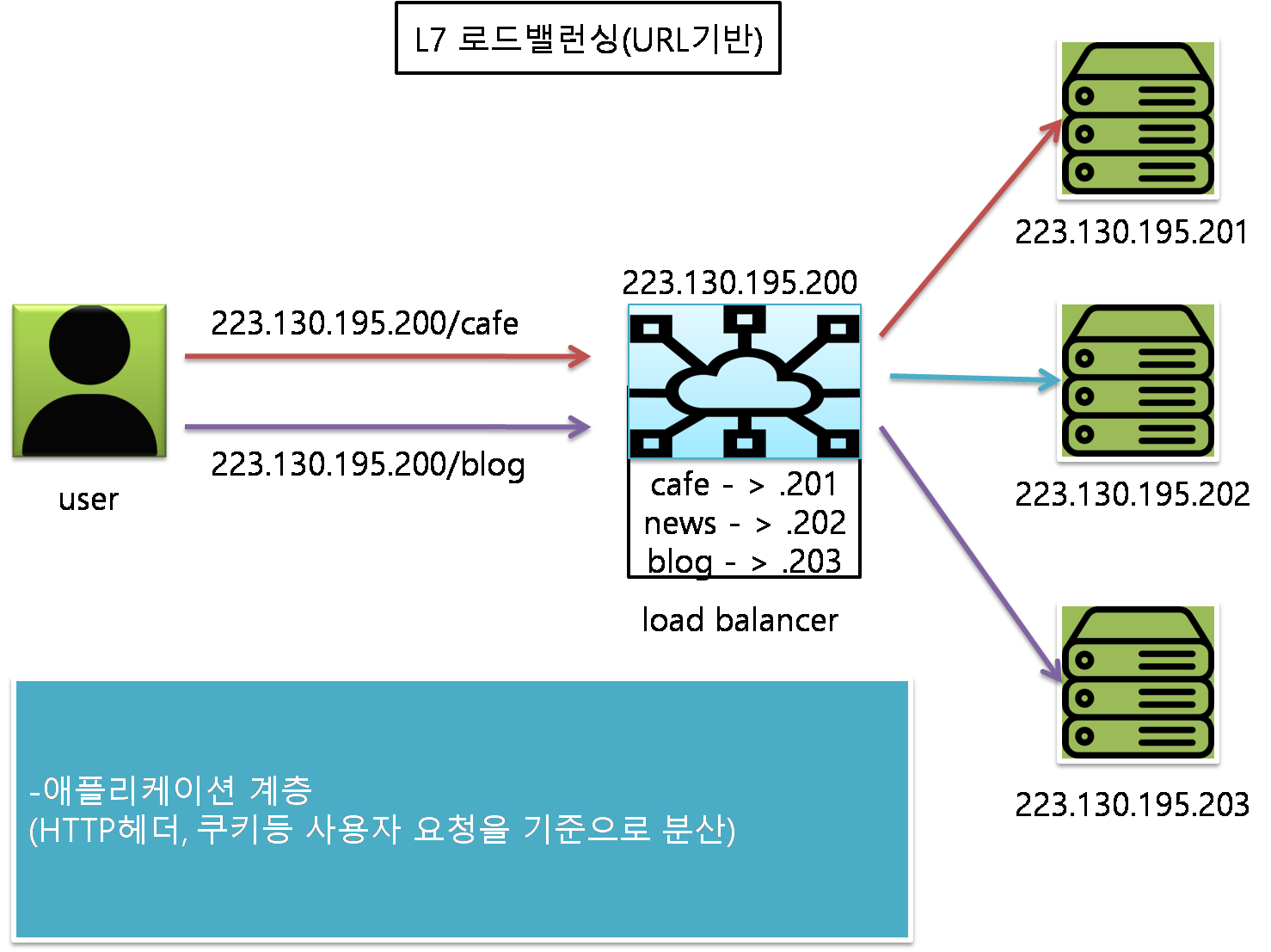 URL기반 로드밸런싱은 포트를 확인 한 후 각 포트에 맞는 서버로 트래픽을 분산하는 방법이다. 위 그림에서는 같은 223.130.195.200으로 요청하더라도 /cafe 요청 시 IP가 223.130.195.201인 서버로, /blog 요청시 IP가 223.130.195.203인 서버로 부하를 분산시키고 있다.