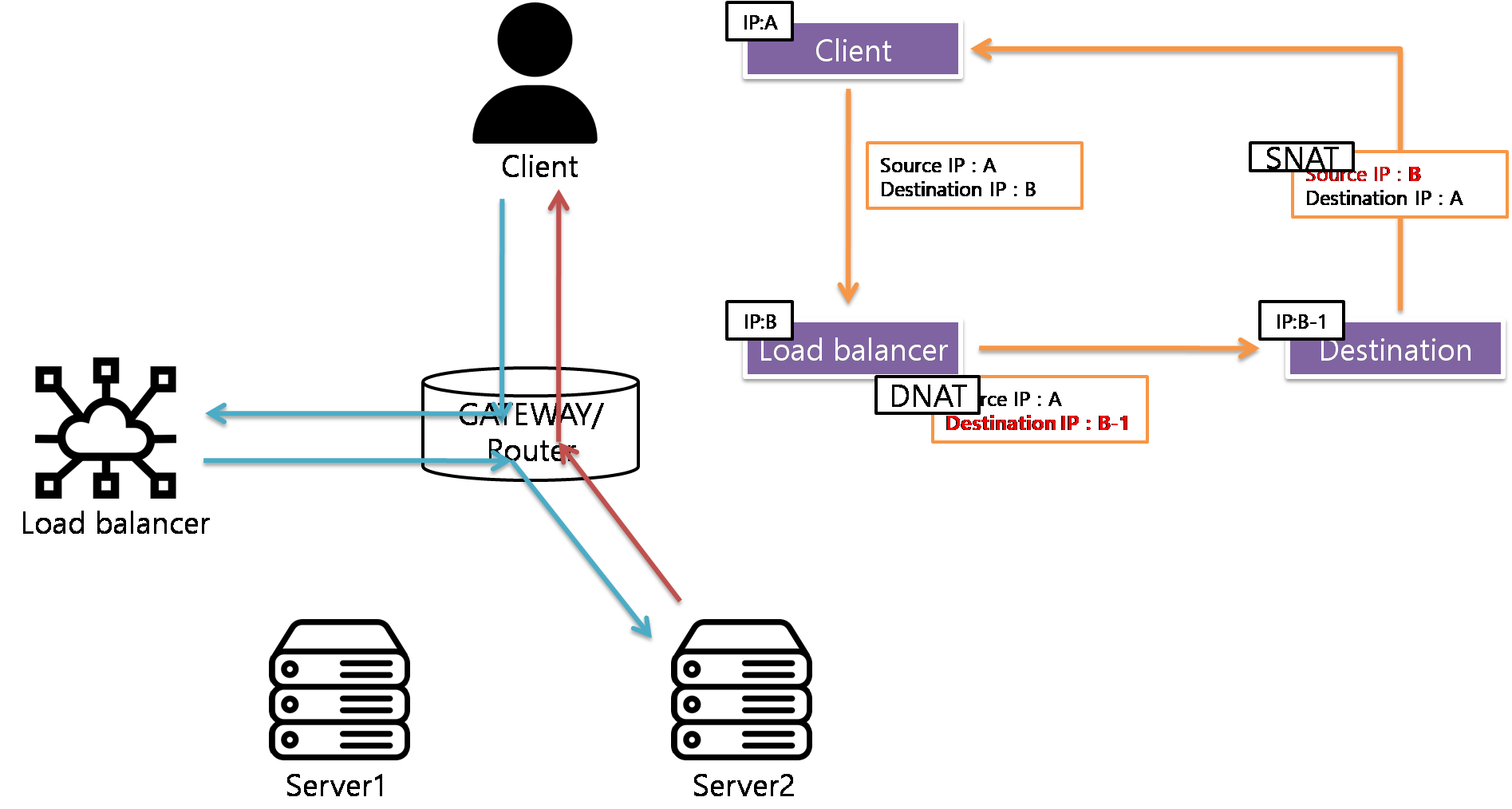 위 그림은 NAT와 DSR을 표시한 그림이다. 로드 밸런서를 경유하여 요청을 받고 있는 서버는 로드 밸런서를 거치지 않고 바로 클라이언트에게 응답을 하고 있다(DSR). 또한 클라이언트는 Destination IP를 B라고 보냈지만 로드밸런서를 거치며 자신의 IP인 B대신 B-1로 수정되어 전달되고있다(DNAT). 또한 Destination은 자신의 IP를 B-1대신 B로 변경하여 응답을 보내고 있다(SNAT).