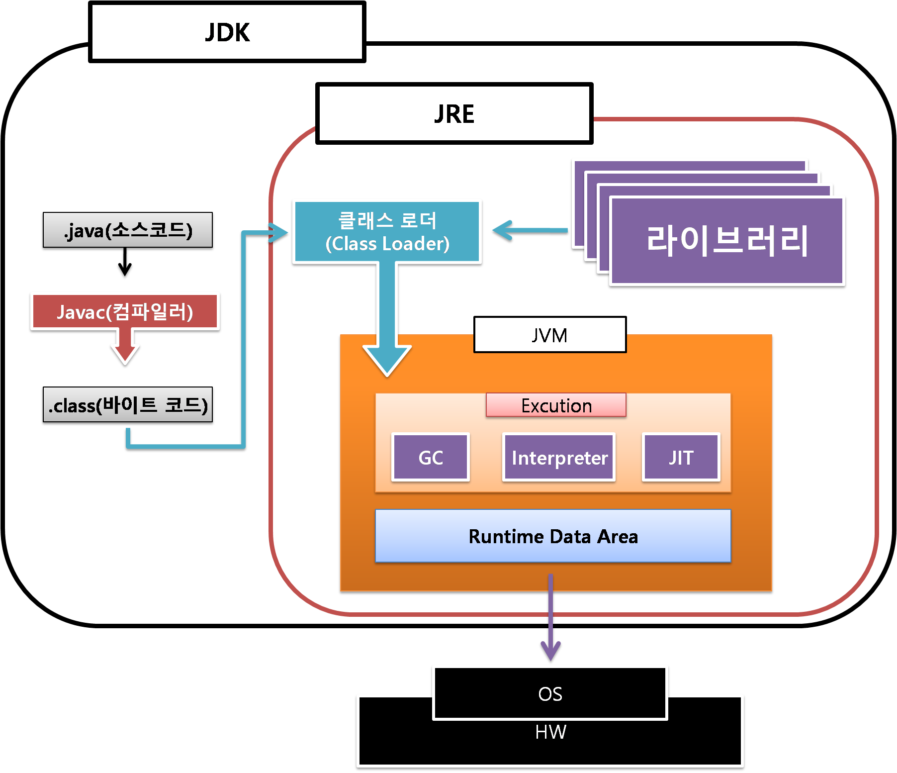 Java를 실행하기 위해서 필요한 도구로 JVM을 포함하고 있다. JRE에는 JVM을 실행하며 필요한 라이브러리들과 바이트코드(.class파일)를 JVM에 올리는 클래스 로더가 있다.