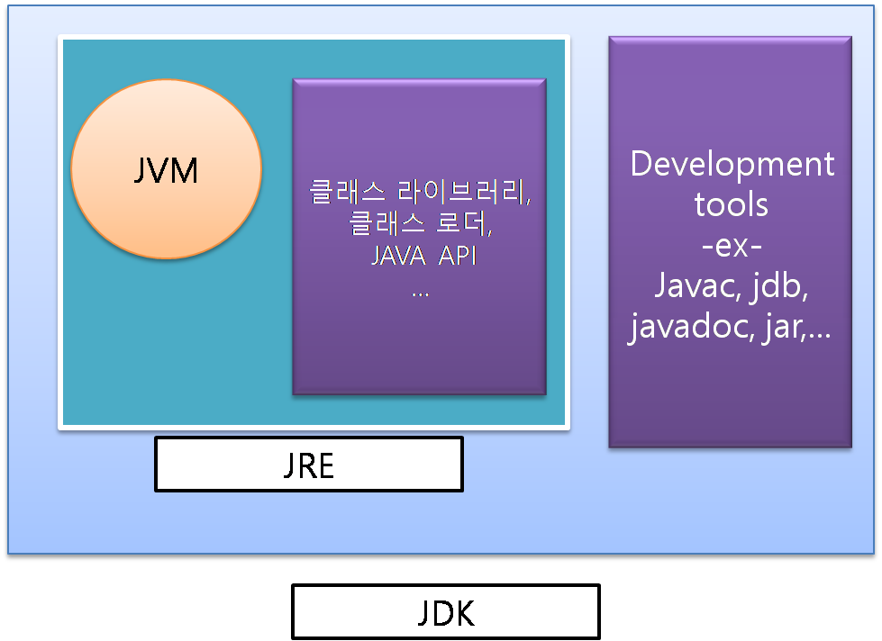 JDK는 JVM과 JRE 분만아니라 자바를 사용해서 개발을 하기위한 도구가 포함되어 있는 kit이라고 보면 될거 같다. 대표적으로 자바 컴파일러가 이에 포함되고 개발자가 아니라면 사용할 일이 없는 도구이다.